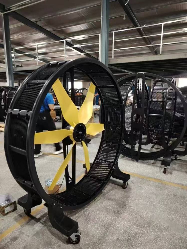 يصل قطر المروحة المتنقلة إلى 1.5 متر. تصميمها المدمج وهيكلها المتين يجعلانها حلاً مثالياً لتوفير الهواء في الملاعب الرياضية في البيئات القاسية.